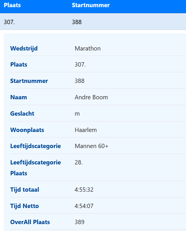 Het lopen, want daar gaat het uiteindelijk ook om, ging mij prima af. Heb heel constant gelopen zonder inzinkingen. De ademhaling en hartslag bleven prima onder controle en dat is hoopgevend omdat ik afgelopen woensdag tijdens een training ineens weer hartkloppingen en kortademigheid kreeg. Dat is al eens medisch onderzocht maar daar kwam niets verontrustends uit, behalve dat ik gevoelig ben voor hyperventilatie. Tot mijn eigen verbazing finishte ik dik onder de 5 uur. Dus ruim binnen de limiet van vijf en een half uur. De vermoeidheid achteraf valt ook erg mee.