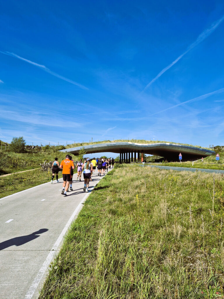 Het ging steeds gemakkelijker en wind en regen konden me niet meer deren. Ik kwam halverwege zowaar in een flow terecht en ook de traditionele dip na zo’n 32 km bleef uit. Het was ook wel gezellig in het bos, met een honden-wandel evenement (gelukkig aangelijnd) begeleid door opbeurend gezang (‘Het regent, het regent en de pannen worden nat…’).