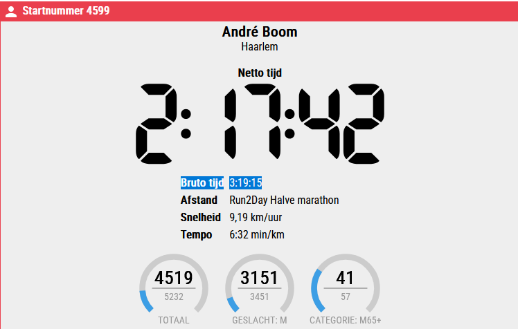 5:19:00 (netto, op basis van eigen rondetijdmetingen)