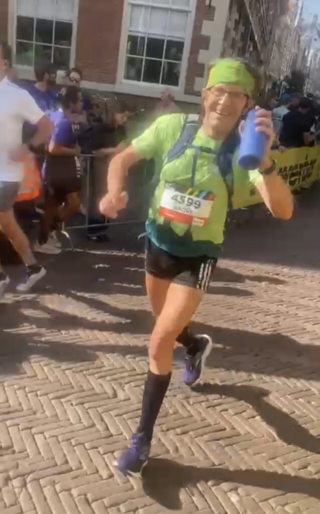 Eindelijk weer eens een volledige marathonronde van 42,2 kilometer gelopen! De laatste keer was de Spijkenisse marathon in november 2023. In januari 2024 kreeg ik een herseninfarct waarna ik geen marathons meer heb gelopen. Wel in juni 2024 de Zes Uur van de Haarlemmermeer, maar dat waren korte rondjes met veel gelegenheid voor onderbrekingen en rustmomenten tussendoor. Nu dus weer een min of meer continu gelopen wedstrijd. Ik moet er wel bij zeggen dat ik heel rustig, zeg maar langzaam, ben blijven lopen in de staart van het peloton. En dat ging zonder problemen tot na de 30 km. Ik wist dat het dan, vanaf Nes aan de Amstel, moeilijker zou gaan worden omdat ik gedurende die hele onderbreking van meer dan een jaar bij het trainen maar enkele keren aan de 30 km had getipt. En de wedstrijden die ik had gelopen waren vooral halve marathons. De 30 van Groet uit Schoorl afgelopen februari was eigenlijk de laatste serieuze proef. Dus het was wel spannend hoe het me zou vergaan.