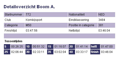 Startnummer: 772 Bruto tijd: 3:47:56 Categorie: M50 : 381 van 1014 (38%) Overall: Plaats 3484
