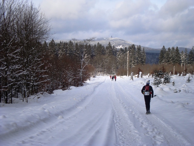 De dikke, vers gevallen sneeuwlaag maakte het ook dit keer weer behoorlijk zwaar. De voeten schoven alle kanten op en de steeds verzwikkende enkels hadden het flink te verduren. Wandelen was geen optie. Met een lichte hardlooppas kwam je onder deze omstandigheden gemakkelijker vooruit dan met wandelpassen. Wat waren we jaloers op de langlaufers die in hun mooie, gladde sporen schijnbaar moeiteloos voorbij gleden. Entsafted, uitgeperst als sinaasappels, wist toch 94% van de 183 gestarte deelnemers het hoogste punt van de Harz te bereiken.