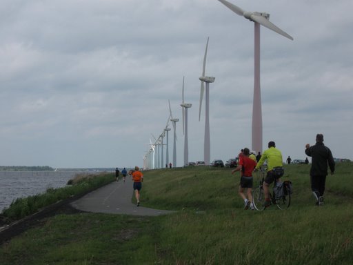 Op het nagenoeg onbeschutte parcours dat voor een deel door de Flevopolder loopt had de wind vrij spel en die was toch sterker dan ik had verwacht. Maar de temperatuur was prima (17C) en al snel trok de hemel dicht met dreigende grijze wolken. Toch beter dan een felle zon op je bolletje. Het bleef echter droog op een paar druppels na maar toen ik net over de finish ging. De meeste deelnemers waren estafettelopers. Je kon 10x50 of 2x25 kilometer lopen. Aan de nummers te zien waren er zo'n 20 á 30 sololopers tegen zo’n 200 teams. Voor de verzorging (behalve water) moest men zelf zorgen, dus ofwel een begeleidende fietser of wel een rugzakje. In mijn rugzak zaten drie bananen, twee 30cc flesjes Cola, een energiereep en een paar pakjes met rozijnen.