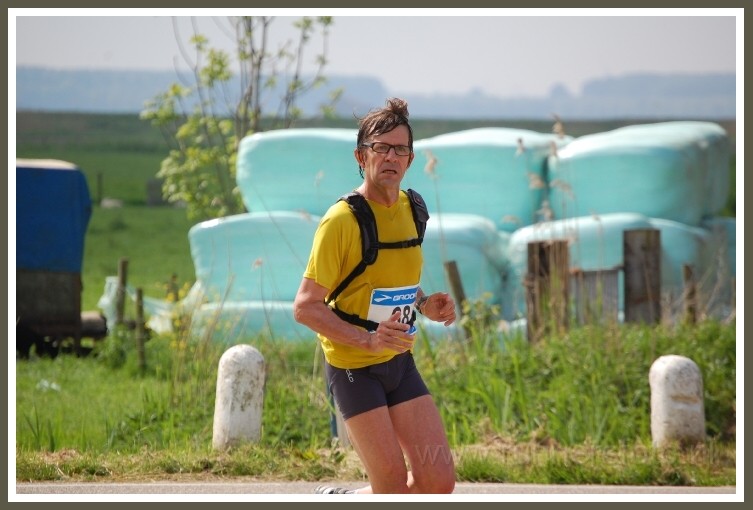 Mooi weer dus, in het eerste deel met wind mee een beetje warm, in het laatste deel toch wel een gevoelige tegenwind. Bij de start kwam ik weer de bekende gezichten tegen van Jack Hendrickx, Dik van Es (ja, die loopt weer na gezegd te hebben er mee te zullen stoppen!) en Ineke Scheffer. Ook Geert Brouwer, mijn maatje van de Athene marathon, was er weer bij. Hij zou vandaag zijn 96e marathon lopen. Veel lopers kregen het onderweg moeilijk. Van de 74 inschrijvers voor de marathon zijn er 18 niet gefinished (hoewel sommigen daarvan wellicht niet eens gestart zijn). Wellicht hebben ze problemen gekregen doordat er op de posten geen voedsel werd uitgereikt, alleen drank. Ik zag de meesten op weg gaan zonder proviand bij zich te hebben. Gelukkig ben ik zo wijs geweest om mijn rugzakje mee te nemen met daarin een flesje cola (tovermiddel) en twee bananen. O, wat zou ik het zonder dat zwaar hebben gehad, ik moet nog steeds aan de hongerklop tijdens de marathon van Ieper denken...