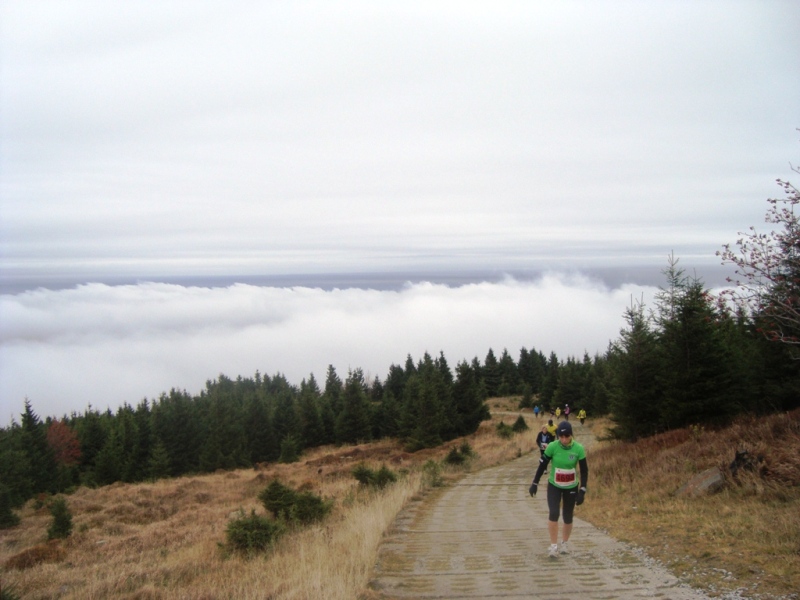 Mooi hoor, die Brocken marathon. Grotendeels trail, prachtige herfstbossen (in de Harz kleuren de bladeren veel eerder dan bij ons in Nederland). Direkt omhoog, eerst nog vals plat, maar na het plaatsje Ilsenburg werd het serieus. Een dikke 9 kilometer klimmen, waarbij het steeds steiler werd. De laatste drie kilometer tot de top (vanaf km 16 ongeveer) bestond uit een ruw geplaveid pad met een stijgingspercentage dat opliep tot 15 en hier en daar zelfs 20%. Binnen twee kilometer stegen we van 700 naar 1000 meter, vervolgens naar de top op 1142 meter. De vrolijk gekleurde bladeren maakten plaats voor sombere sparren die steeds kleiner werden. Op het Brockenplateau waren ze verschrompeld tot dwegachtige stompjes. Je zit dan net boven de boomgrens. Heel even klaarde het wat op en onder ons zagen we een donzige zee van wolken. Maar meteen daarna sloeg de mist weer toe en daalde de temperatuur naar 3 graden bij een aantrekkende wind. Het spookachtige silhouet van de grote zendmast was op korte afstand nog net te zien. De organisatie reikte lelijke felgele poncho's uit maar ik had mijn onafscheidelijke rugzak bij me met daarin een windproof jack.