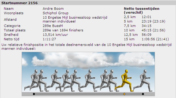 Ja, ik kan nog 'knallen'! De vrees dat al die marathons en ultra's mijn snelheidsvermogen hebben afgevlakt bleek tijdens de 25e editie van de Dam tot Damloop volkomen ongegrond. Met 13,514 km/uur gemiddeld over de 10 Engelse mijl snelde ik naar een 2e tijd ooit op de 10EM en een eerste plaats binnen het business team van de Schiphol Group. Aan de grafiek is te zien dat het eigenlijk alleen maar steeds sneller ging.