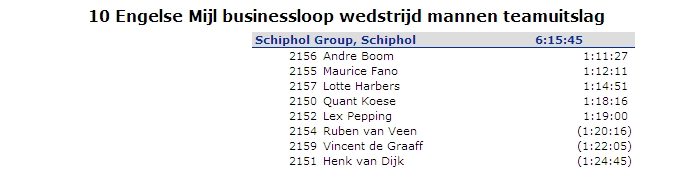 Schiphol Group: 1 van 23 Teamuitslag (totaaltijd 8 wedstrijd lopers):75 van 200 (6:15:45)