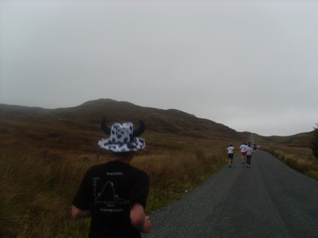 Na de Connemara in maart heb ik afgelopen zondag mijn tweede Ierse avontuurtje beleefd, dit keer in het uiterste noordwest puntje van het 'Magical Island'. Het was een marathon met de koe als thema. 'Boe' is 'Moo' in het Engels, vandaar de naam 'Mooathon'. Sinds 2006 als halve georganiseerd en dit jaar voor het eerst als hele. Alleen zwart-met-witte kleding was toegestaan en velen hadden zich in complete koeien-outfit gehesen, compleet met horens en uiers. Dat dat niet zo lekker loopt bleek al snel, want bij het eerste klimmetje na 1 mijl kwam ik al de eerste wandelaars tegen. Nou was dat geen probleem, want de halve afstand mocht ook gewandeld worden. Zodoende finishte ik temidden van een kudde wandelende 'koeien' die zo'n vier uur over de halve gedaan hadden. Het verzamelpunt was in Letterkenny in county Donegal, dat grenst aan Noord-Ierland. Vandaar met de bus naar Kilmacrenan waar de start plaatsvond. Niet met een pistoolschot maar met een loeiende megafoon. Vandaar ging het alsmaar noordwestwaarts, richting de Atlantische kust. Halverwege moest een substantiële heuvelkam (Loughsalt Mountain) getrotseerd worden en toen was het uit met de koeienpret. Vanaf de oceaan stond een harde wind, windkracht zes, en vanaf zee dreef lage bewolking en mist binnen zodat alles grijs werd. Ideaal dus, want daarvoor was ik tenslotte naar Ierland gegaan, voor dat sfeertje. De halve eindigde in het havenplaatsje Downies, waarna er voor de marathon nog een lus rond het Rosguill Peninsula gelopen moest worden.