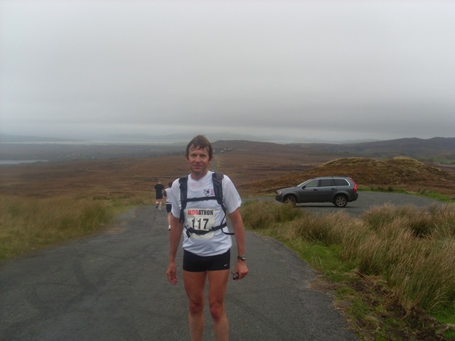 'Very tough', was het predicaat dat de meeste finishers (alle 39 marathonlopers haalden de finish) na afloop aan dat gedeelte gaven. Inderdaad. Er zat een hele lange klim in met wind tegen die op sommige stukken zo steil was dat je op je tenen lopend naar boven moest, alsof je een trap opliep. Afdalen op zulke steile gedeelten was eigenlijk nog erger, vooral de kuiten kregen er van langs door het voortdurende inhouden ('laten rollen' moet je daar echt niet proberen, je gaat over de kop). Maar het landschap was fenomenaal, ruig en dun bevolkt. Rotsblokken en heide met prachtige vergezichten over de oceaan, zoals bij Rinnafaghla Point (De grijze massa wilde gelukkig net toen even optrekken). Een minpuntje was dat er in dat gebied helemaal geen toezicht op de lopers was. Er stonden wel twee drankposten, maar die waren 'self-service', onbemand dus. Een tafeltje met een paar keien erop tegen het omwaaien en jerrycans met water en sportdrank. Je zag niemand, ik heb slechts twee mede-lopers gezien. Als je wat zou overkomen zou je niet zomaar hulp hebben. Later sprak ik een vrouw die gevallen was en blij was dat het bij een paar schaafwonden was gebleven. Voortaan bij dit soort dingen maar weer een mobieltje meenemen. Ondanks dat ik wel tien keer ben gestopt om foto's te maken en twee keer een afslag had gemist (daar stonden geen pijlen) kwam ik binnen in 4:07:49 wat gelet op het zware parcours wat mij betreft prima was. Pijn in mijn kuiten en een 'totaalervaring' rijker.