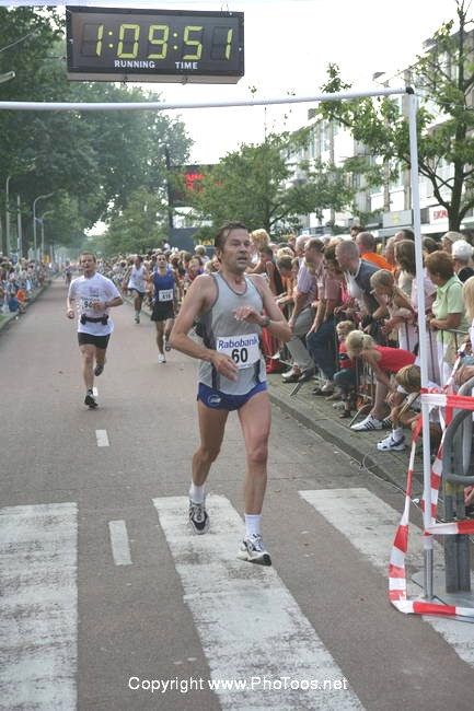 Wat was deze Pierloop zwaar! Net als op 11 september 1999 (toen was het zelfs nóg warmer) waren de omstandigheden tropisch. De temperatuur viel misschien nog mee, 24 graden in de schaduw tot 27 graden in de duinen, maar de luchtvochtigheid was gigantisch (80%, oplopend naar 90% en tegen de avond gevolgd door onweer). Vooral het eerste deel van het parcours, door de duinen richting het strand, met het beetje wind dat er nog stond in de rug, was het gewoon een stoombad. Dan mag ik met een eindtijd onder de 1:10 (1:09:49) nog helemaal niet klagen! Deze september is toch wel heel uitzonderlijk, het is nu al twee weken warm en zonnig en dat na weken lang veel te koel vakantieweer in een hardnekkige noordwestcirculatie. Deze Pierloop was de 3e wedstridj in één week (in totaal 41 wedstrijdkilometers!) en ik heb echt moeite met herstellen. Het is nu (half negen 's avonds) nog steeds erg warm en drukkend, en even lekker uitrusten op bed is niet eens mogelijk, het zweet breekt je meteen aan alle kanten uit. Ik ben erg snel gestart (de eerste 2 km binnen de 8 minuten), maar moest al snel vaart minderen. Ingrid Dekker, die altijd van de partij is, ging me op de 4 km al voorbij en er leken er steeds meer te volgen die datzelfde deden. Maar ik heb me niet gek laten maken, want ik moest steeds denken aan de marathon van Berlijn over twee weken. Ik dacht: ik blijf lekker op 80 à 90%, ruim op reserve dus, lopen en maak er desnoods gewoon een trainingsloop van. Daardoor vond ik rust en een ritme dat ik vast kon houden. De loop stabiliseerde zich na zo'n 8 kilometer, er kwamen geen mensen meer voorbij en er begonnen zich vaste groepjes te vormen. Op het strand verloor ik zo'n 1 à 2 minuten, maar dat is normaal. Het was goed beloopbaar en op de wat rullere gedeelten probeerde ik in de wielsporen van auto's (waarschijnlijk van de organisatie) te blijven die er gereden hadden. Ná het strand op 11 km (versterkt door een héle banaan die door het personeel van een restaurant bij IJuiden haven werd uitgereikt - dank u!) hervond ik weer mijn oude tempo en kwam ik bovendien in een mooi groepje terecht zodat de 12-13-14 km probleemloos verliepen. De laatste kilometer in IJmuiden kon ik wat versnellen en zo kwam ik in mijn eentje nét binnen de 1:10 onder het finishdoek door. Wát bleek ik er toen doorheen te zitten, zeg! Veel drinken en een heerlijke douche in de sporthal deden hun goede werk, maar in mijn hele lijf voel ik de spanning nu nog steeds. Ja, de komende twee weken moet ik het nu eens echt rustiger aan gaan doen!
