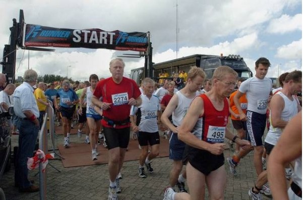 201 kilometer via de Afsluitdijk, gaf de routeplanner aan. Aardig eindje weg, maar wel te doen zou je denken. Als ik om half één in Ulrum ben, dan is er genoeg tijd om het startnummer op te halen, om te kleden en met de Arriva bus naar de start in Lauwersoog te rijden, die om 1400 zou plaatsvinden. Half 10 van huis moet dus ruim voldoende zijn, schatte ik in. Inderdaad, tot Leeuwarden reed het aardig door, ondanks de vele auto’s met caravan die deel uitmaakten van de vakantie uittocht. Maar daarna… Niet de auto’s vormden het probleem, maar de bootjes! Drie keer voor een geopende brug gestaan ergens in het Fries-Groningse land terwijl ik nagelbijtend een eindeloze stroom voorbij zag dobberen van tjalken, sloepen, vletjes en wat de vakantievierende mens al niet meer aan het varen heeft gekregen. Kwartiertje wachten? Het zou wat, moet de brugwachter gedacht hebben, ’t Is toch vakantie?. Kwart voor één was ik in Zoutkamp (laatste bus zou om 1315 vertrekken) en met nog maar 5 km te gaan naar Ulrum moest het toch lukken. Alleen… Twee km vóór Ulrum was er nog één bruggetje… open! Nooit zó de zenuwen gehad. Stond op het punt naar de brugwachter te lopen: ‘Hé, ik heb 200 km hierheen gereden en 600 of zo km getraind om de halve in Ulrum te lopen dus gooi nou direct die brug dicht!’. Ik was al dreigend uit de auto gestapt toen het gevaarte knarsend begon te zakken nadat de laatste botter gepasseerd was. Ik héb de bus gehaald maar was in de bus nog bezig om me om te kleden. Aan de start in Lauwersoog kon ik zowaar nog tien minuten inlopen op het winderige haventerrein tussen de viskotters en viskraampjes en daar ging-ie dan.